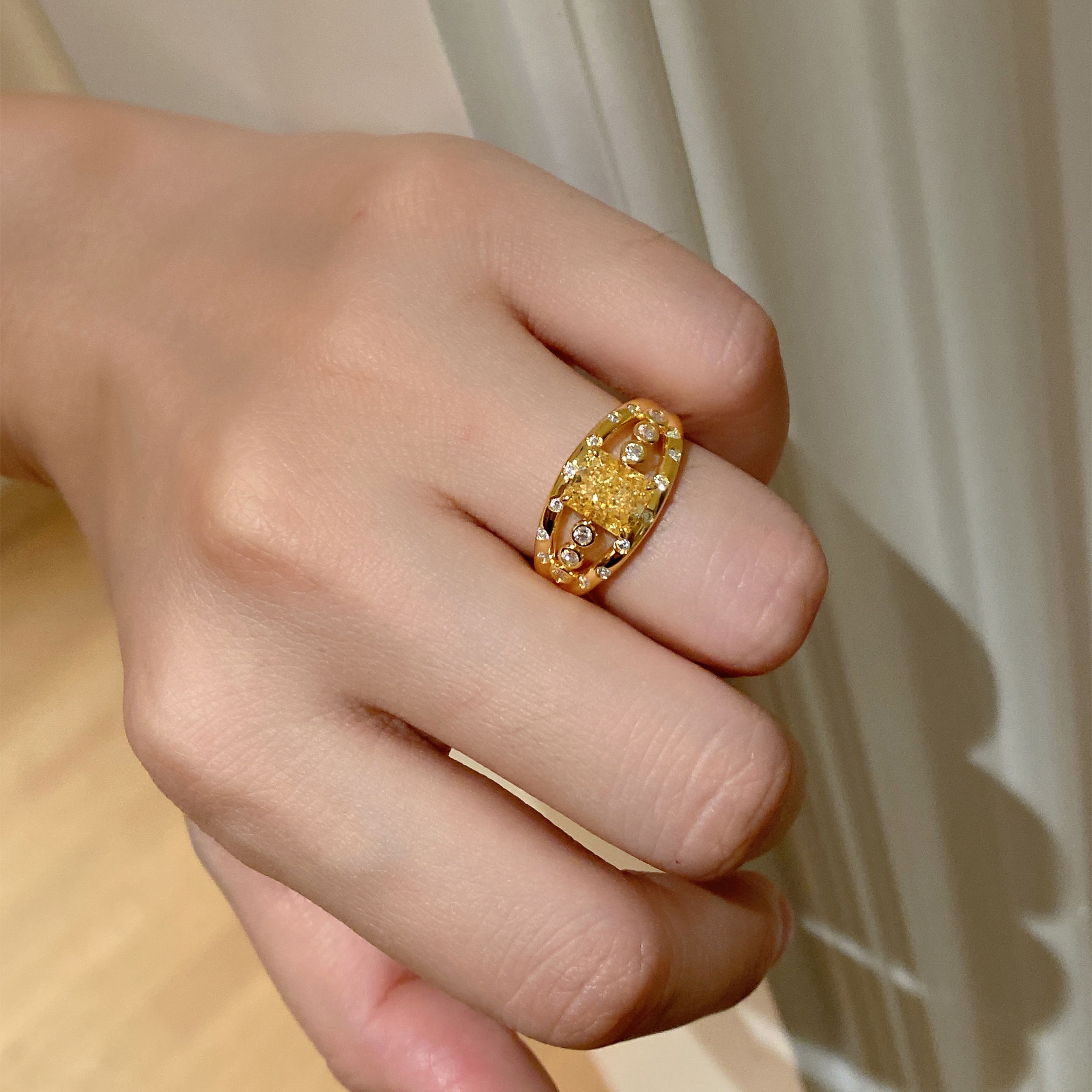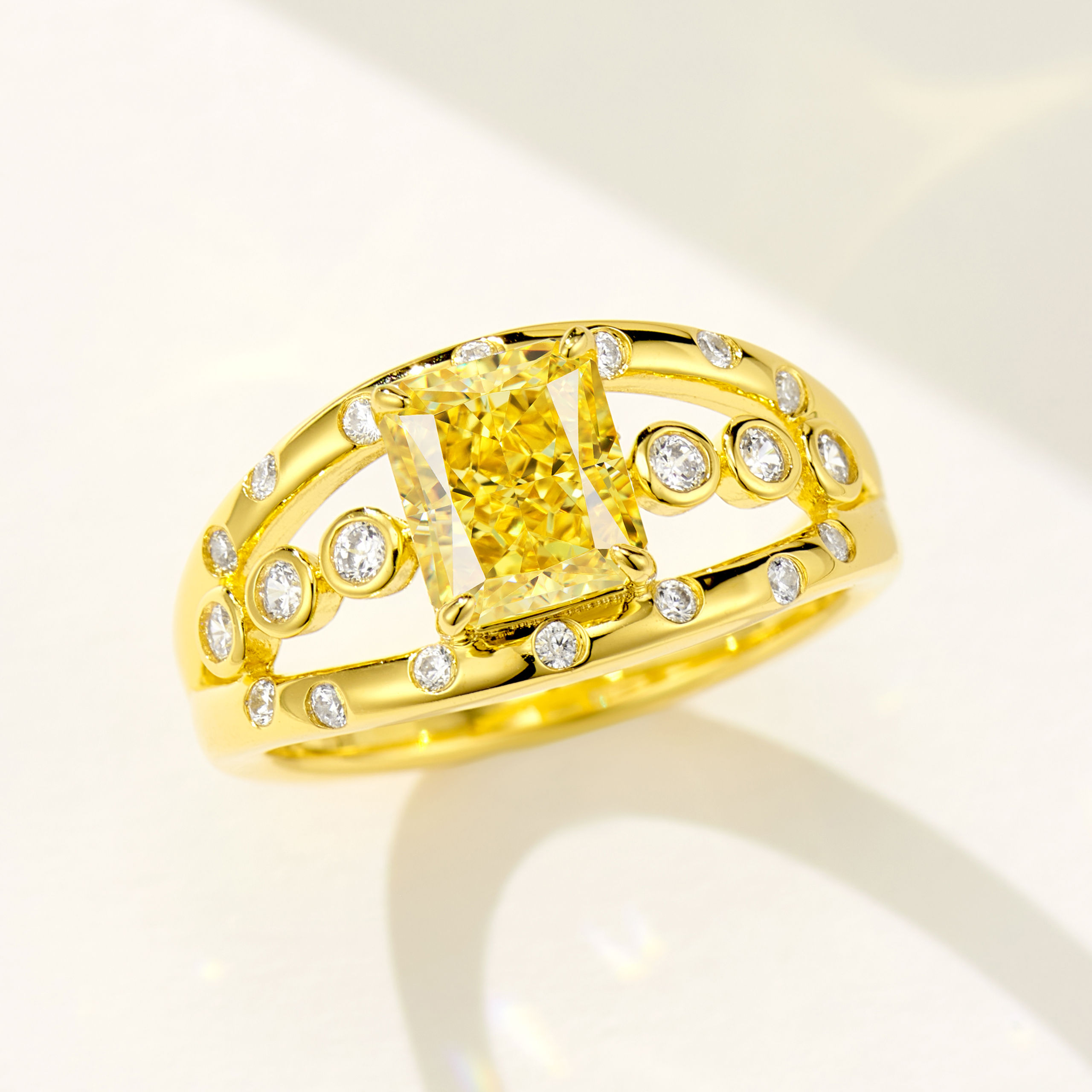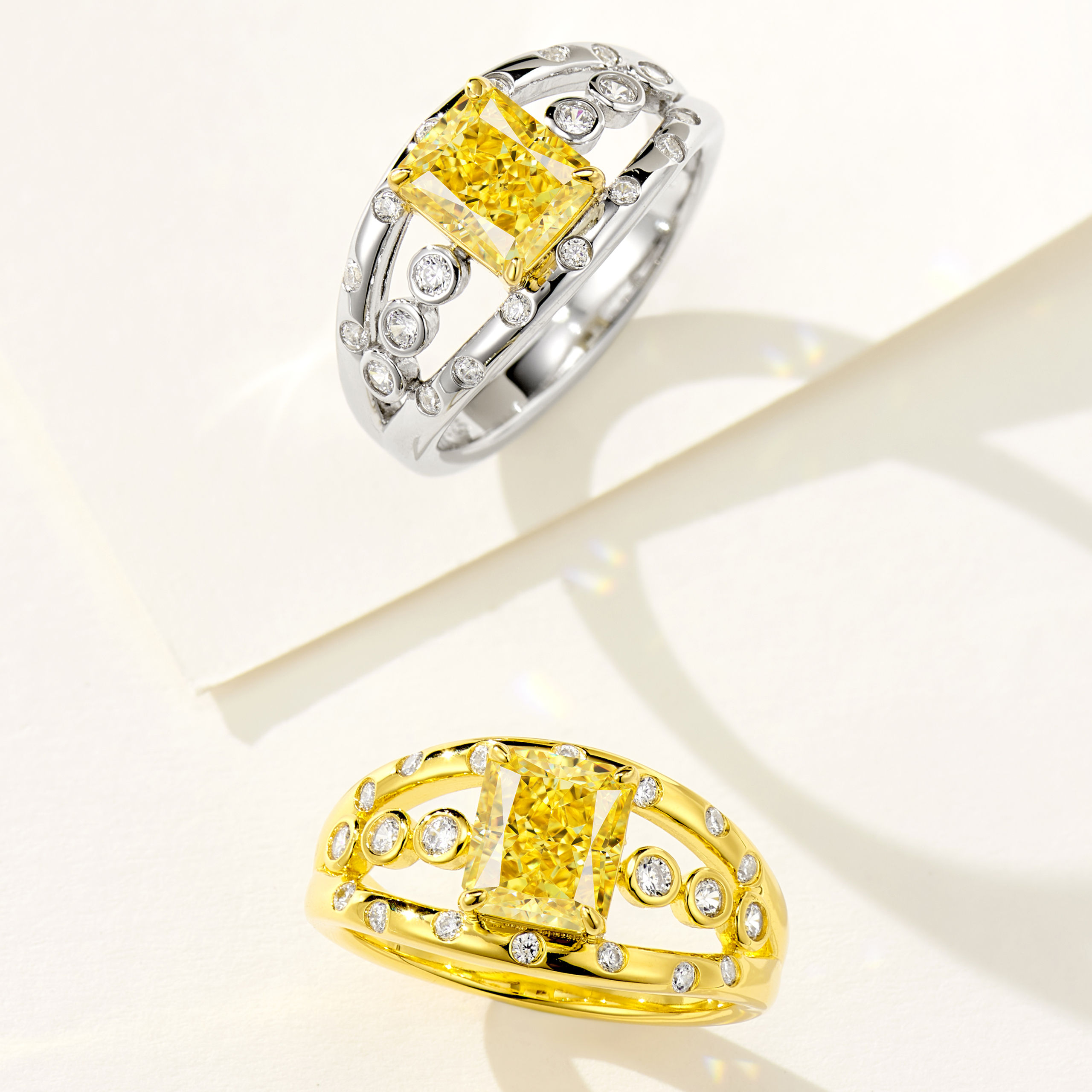 A vivid yellow diamond set in a celestial-inspired band, capturing the brilliance of twilight. Timeless elegance for unforgettable moments.💎