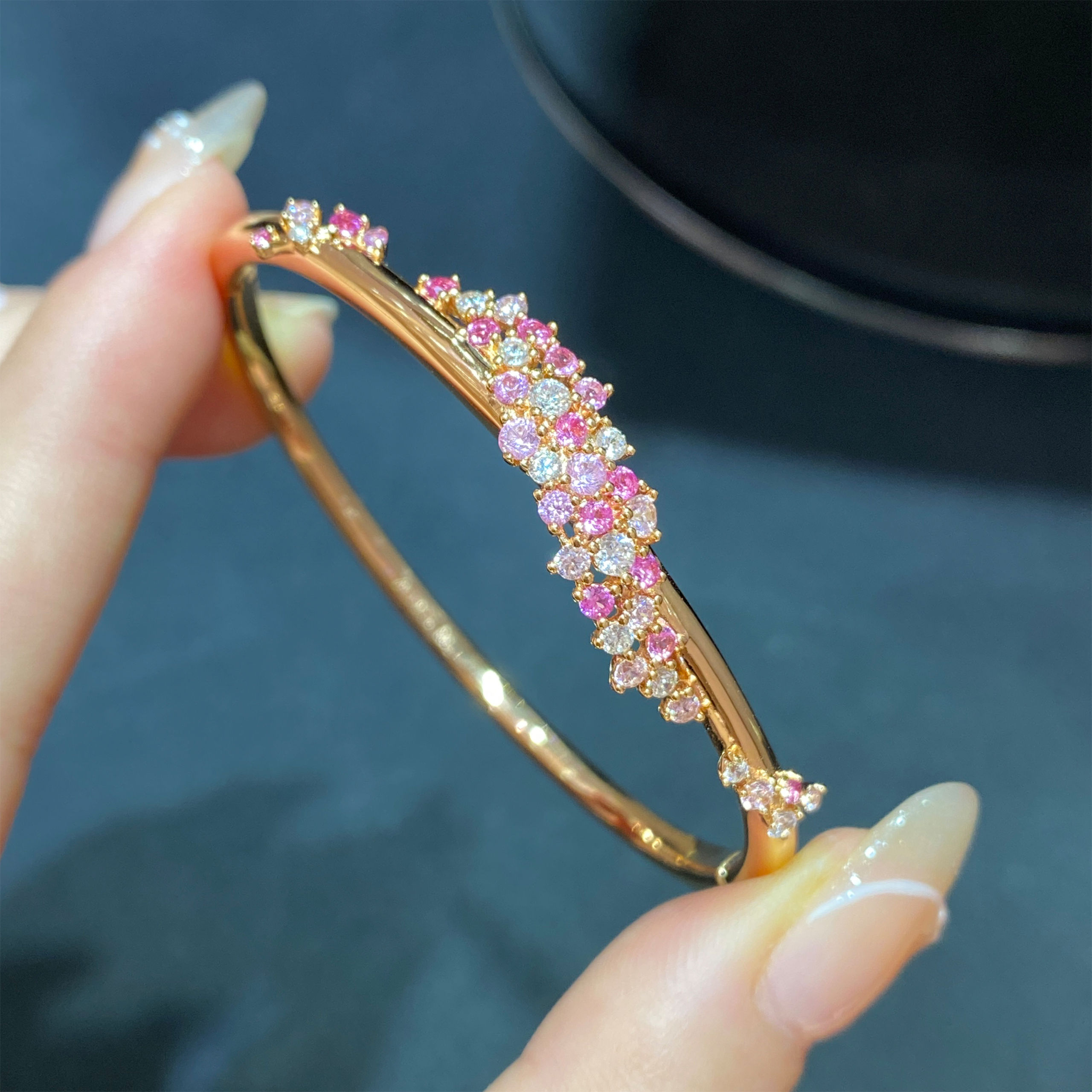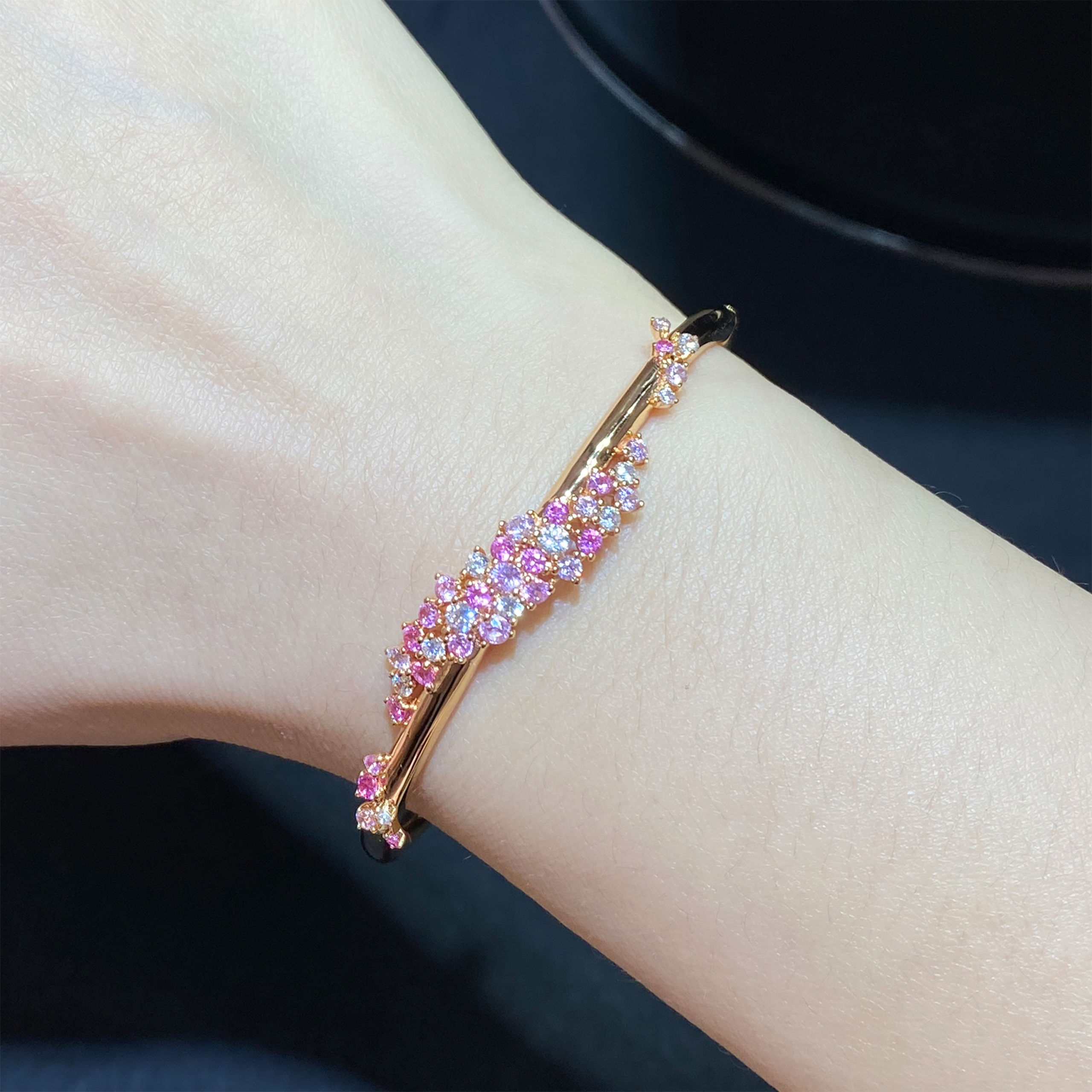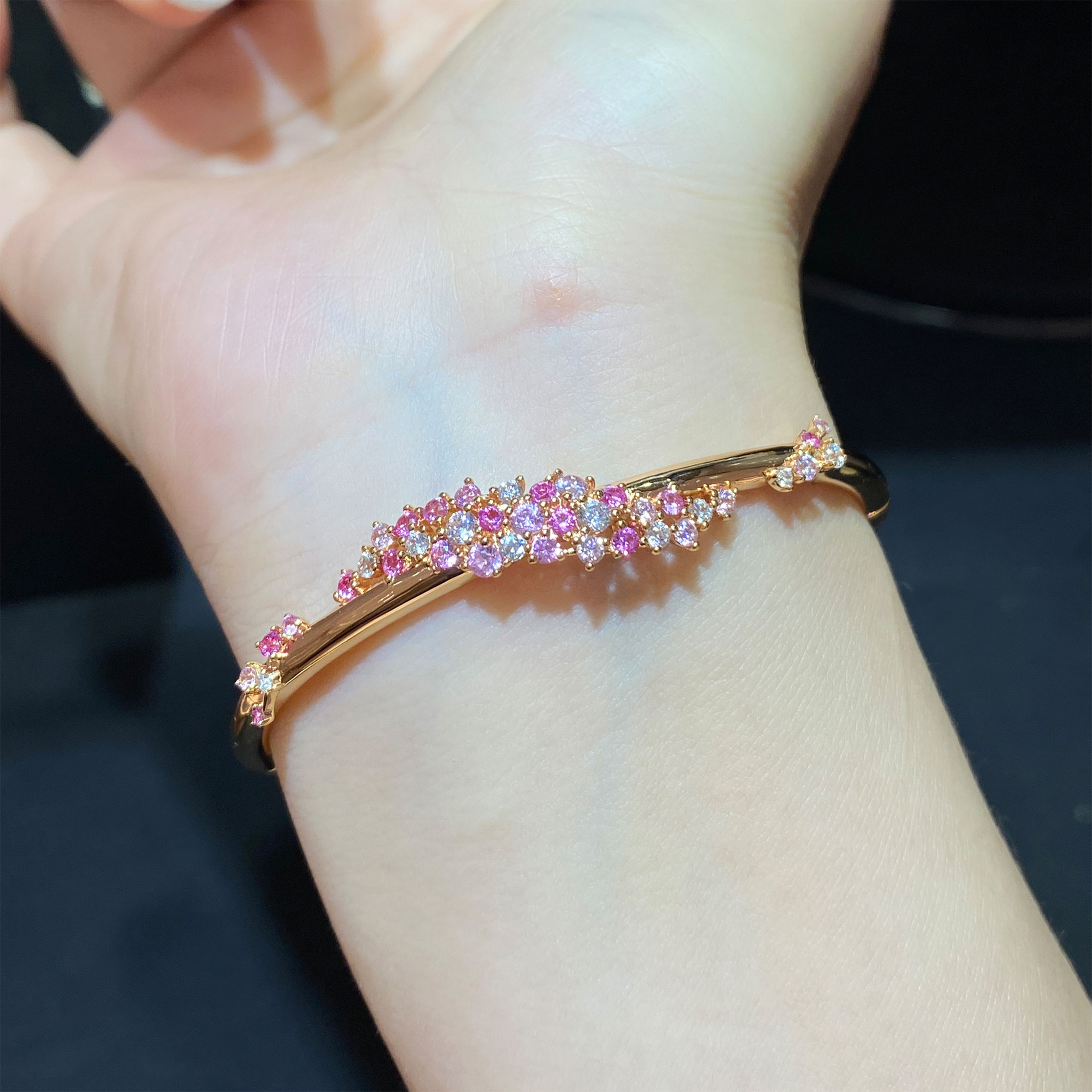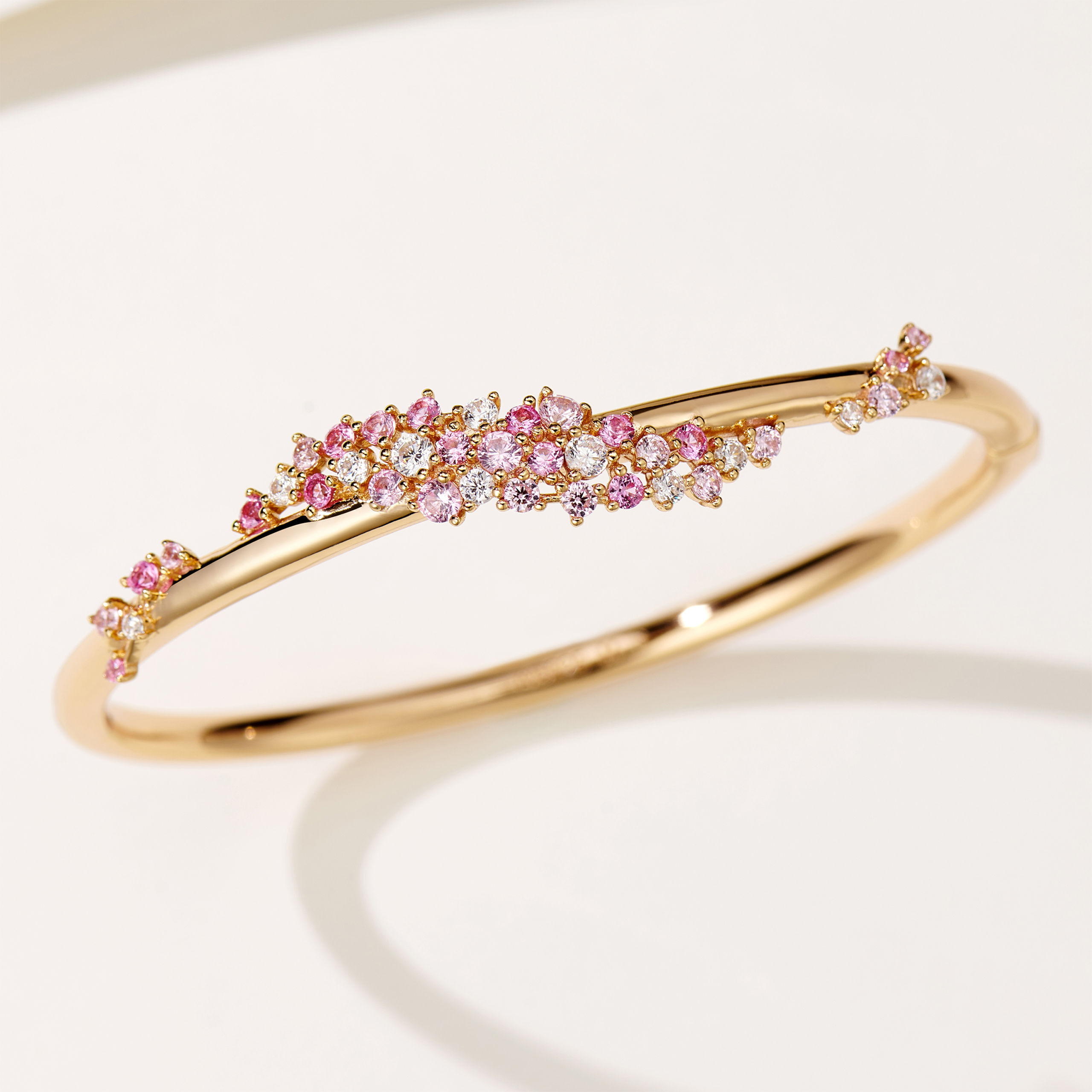 Delicate floral designs surround gradient pink cubic zirconia—blooming like a secret garden, transitioning from soft white diamonds to light pink to romantic pink. Suitable for layering or wearing alone. Infuse your everyday or evening look with romantic elegance 💖 A classic and feminine design, perfect as a gift or a treat for yourself.