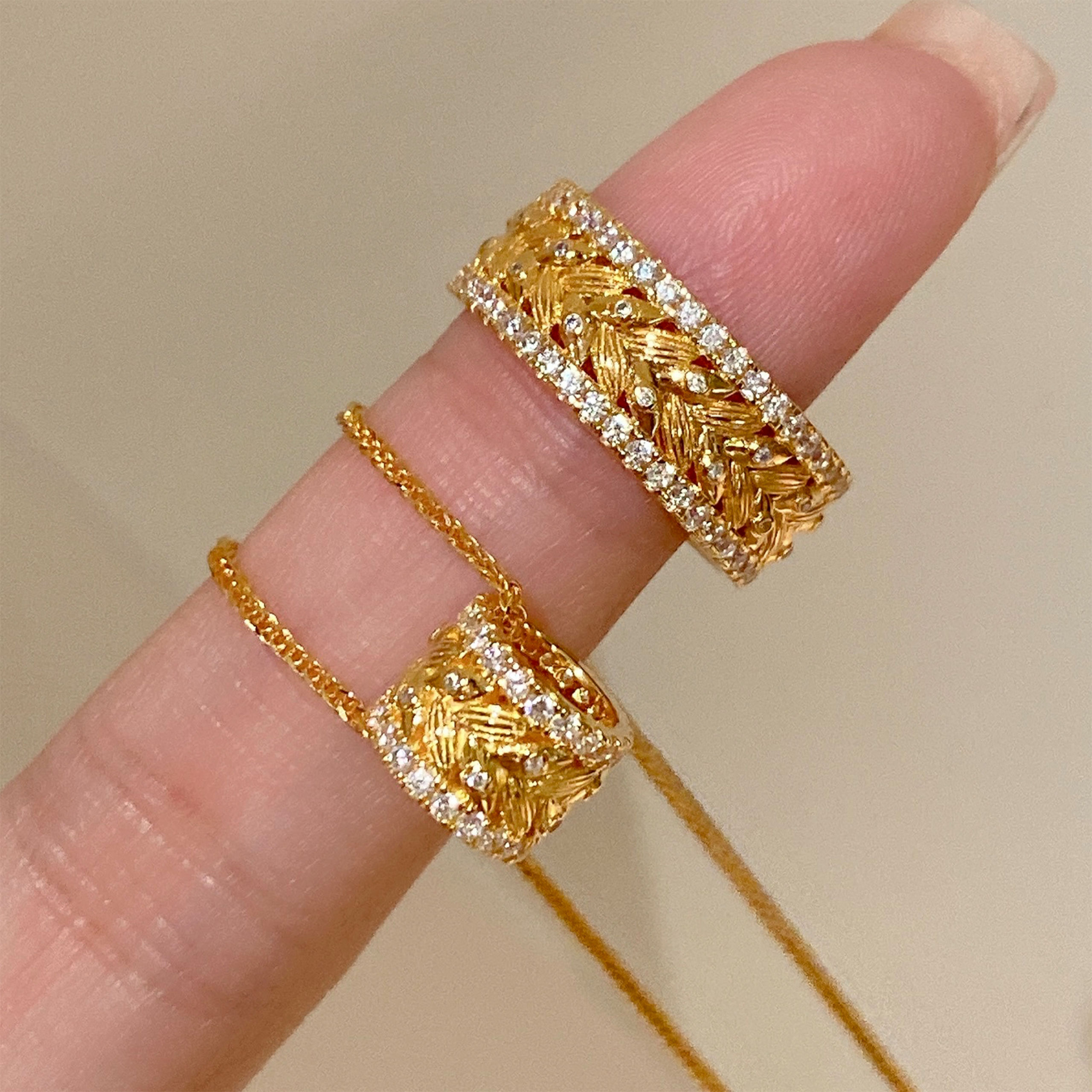 This understated yet elegant design is easy to wear for everyday life. The golden wheat ears symbolize a bountiful harvest, and the tiny diamonds complement the ears, making it even more exquisite. Both pieces are made entirely of 925 silver plated with gold, with the necklace having a 0.3mm thick plating and the ring a 1mm thick plating, far exceeding the standards of market products.