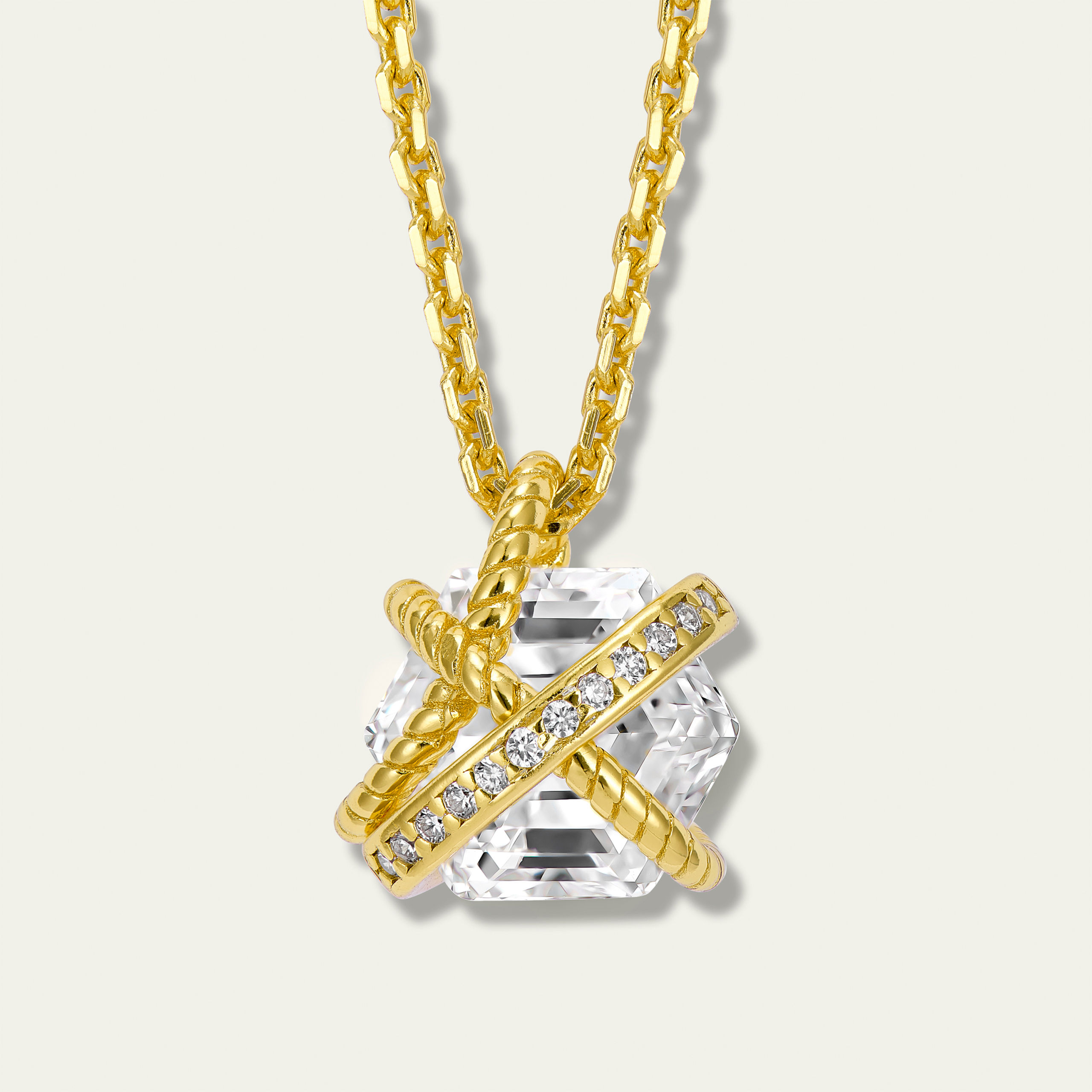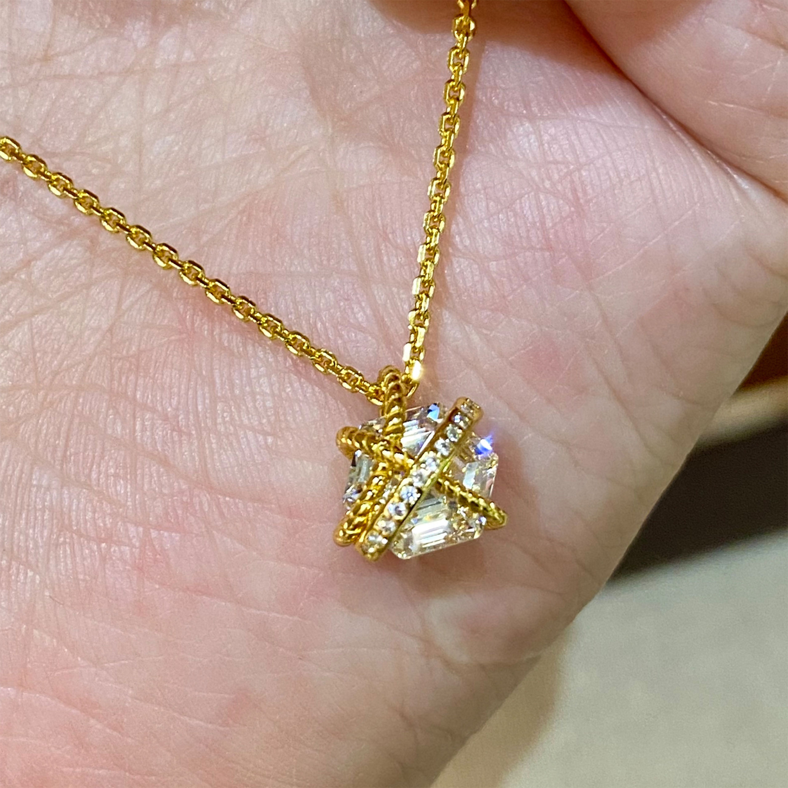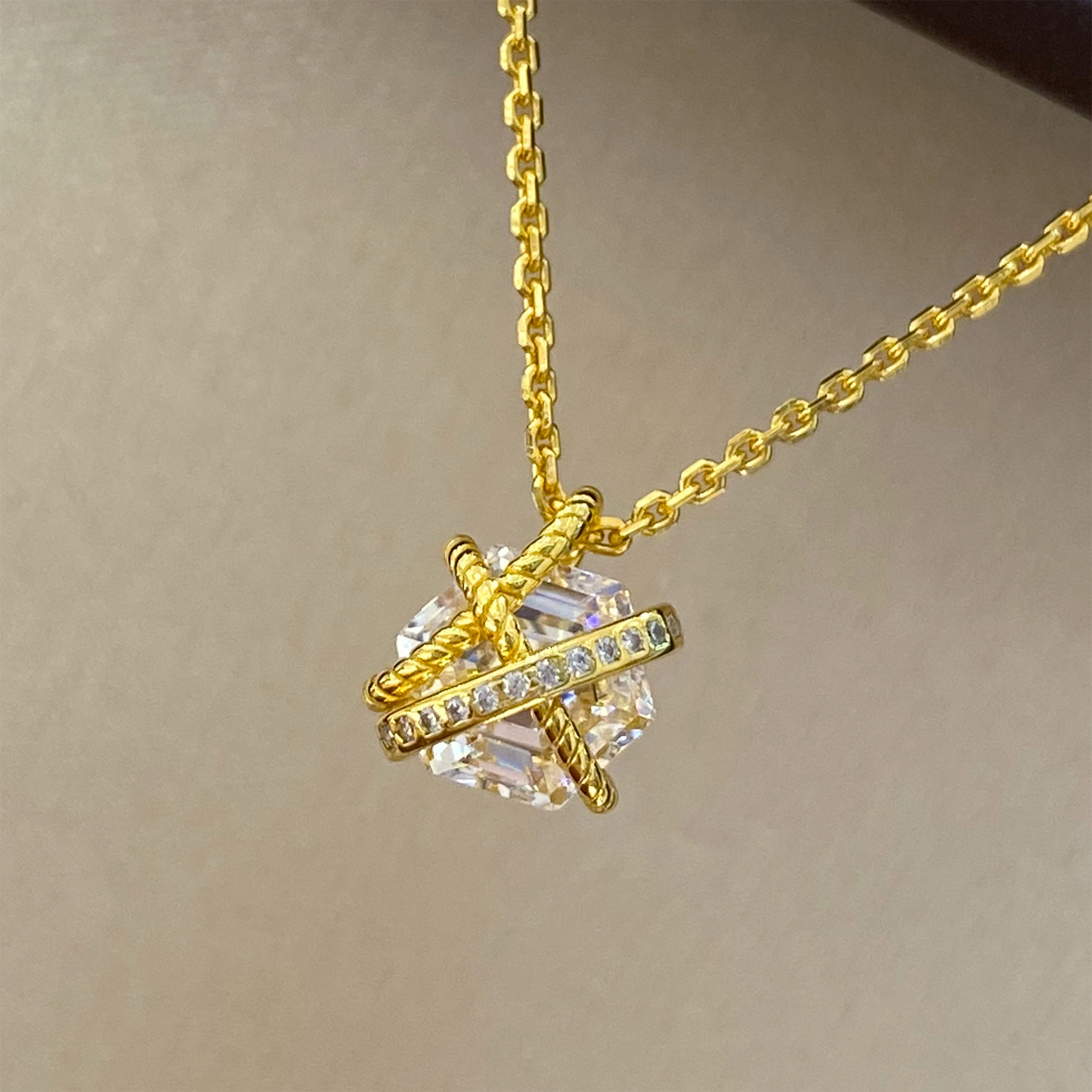 A striking hexagonal-cut diamond is encased in interwoven links, the bold, swirling design creating a geometric sparkle. The 45cm chain length—offers a touch of sharp elegance to any everyday look or evening occasion. A modern minimalist creation for the bold-minded individual. 💎