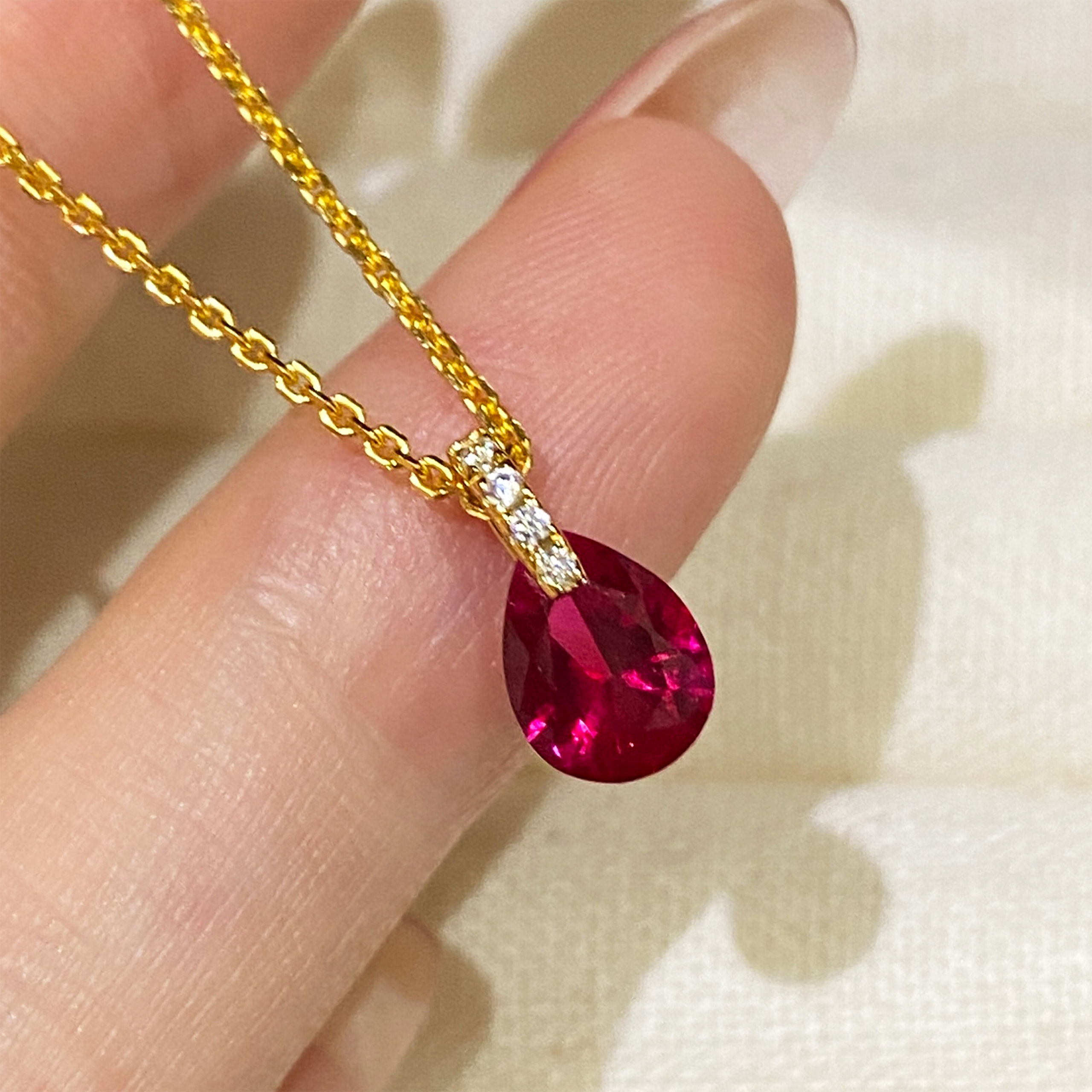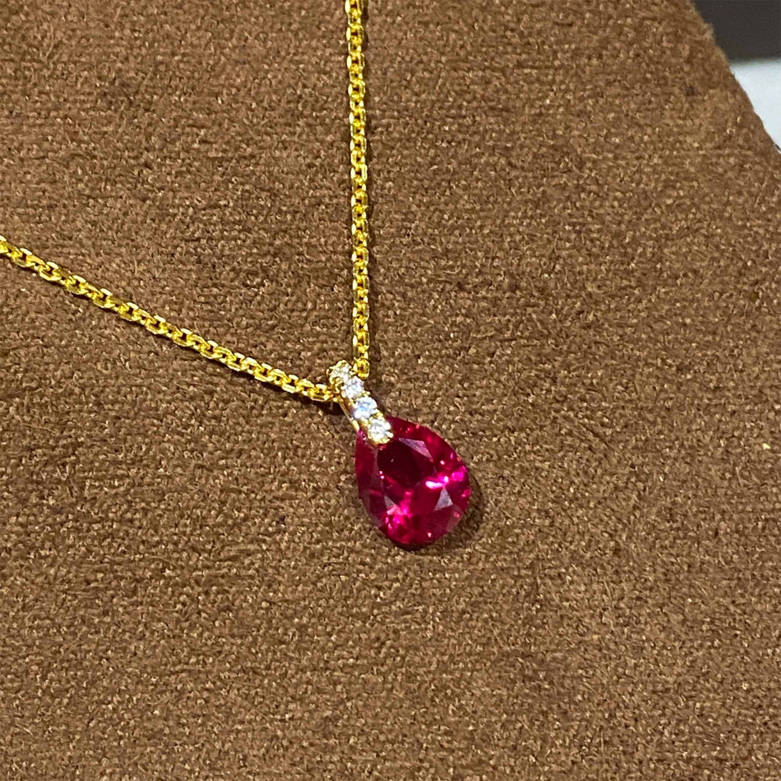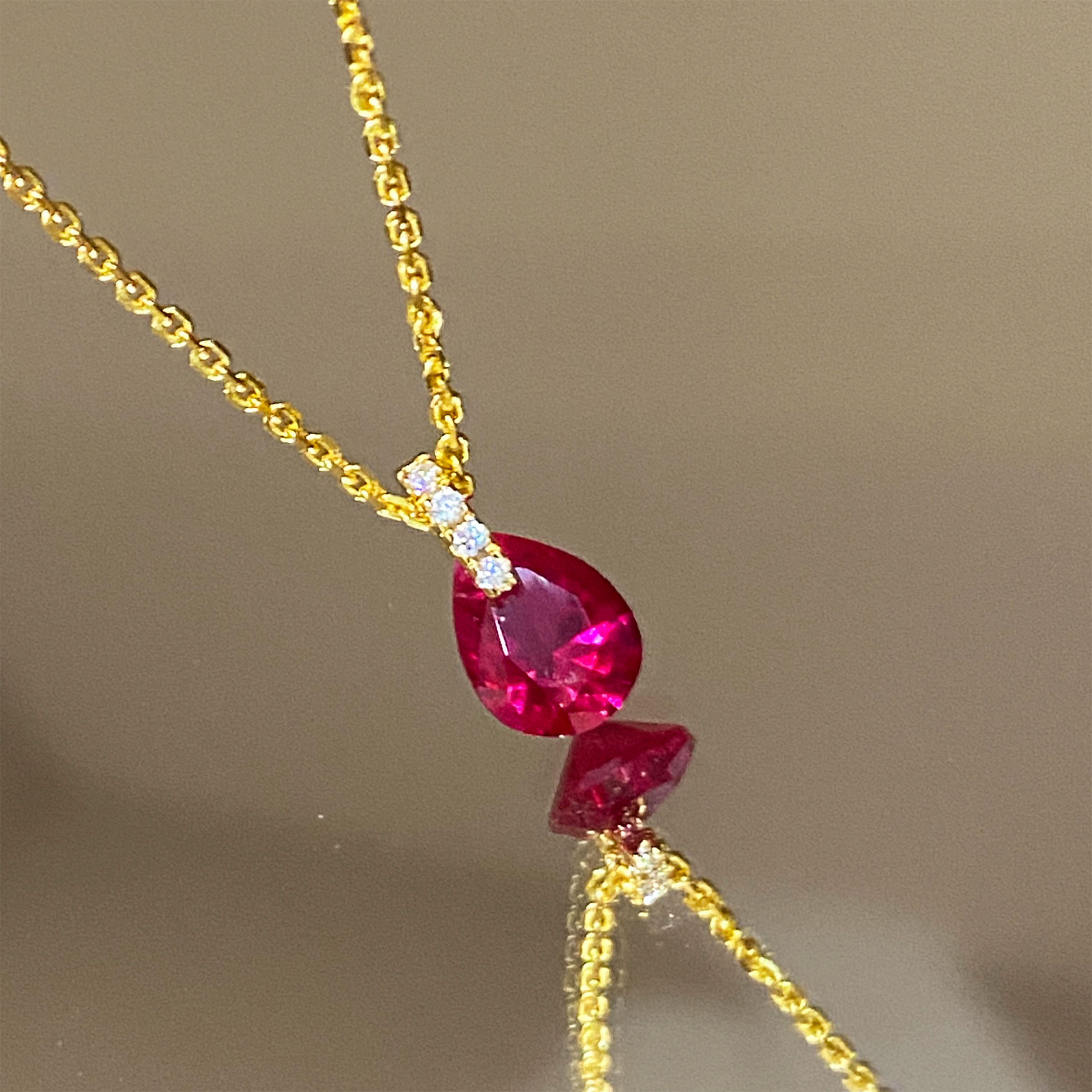 A teardrop of vivid crimson corundum dangles from a thin, sleek chain—minimalist yet striking. It sits gently on the collarbone, adding a touch of bold, understated luxury to casual days or formal nights 🔥✨
