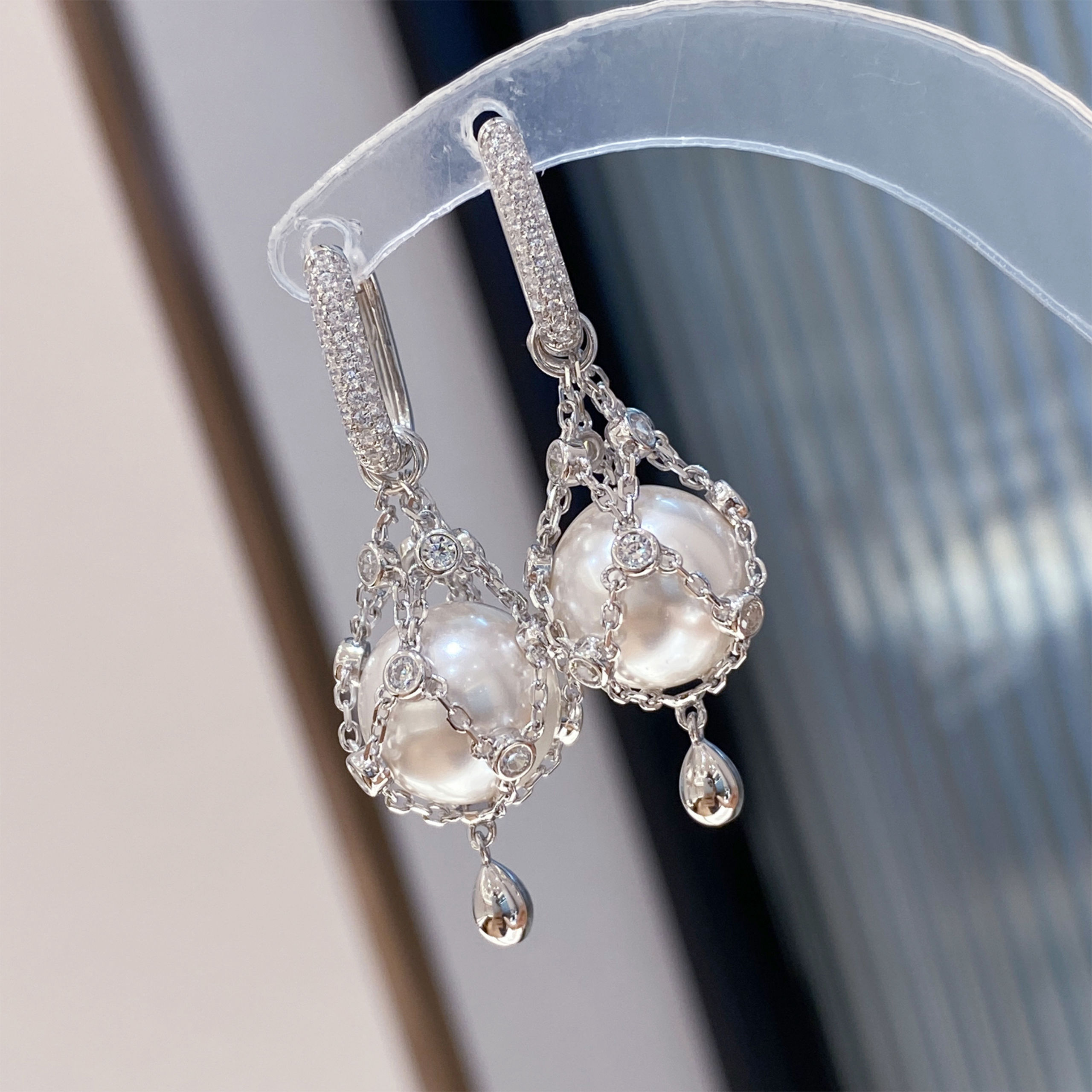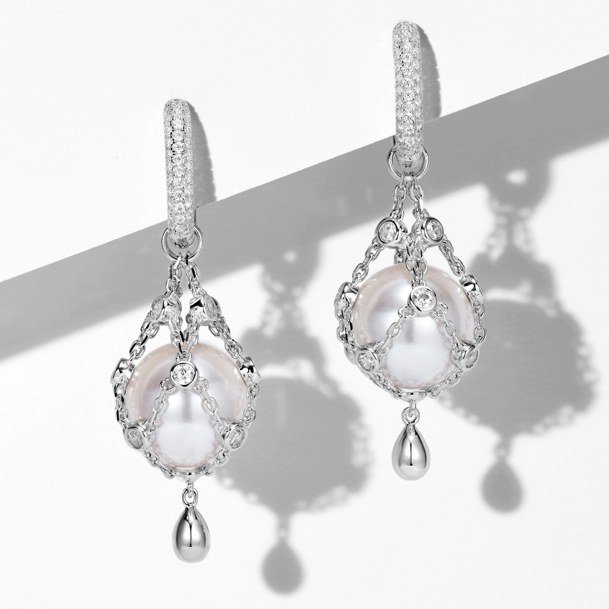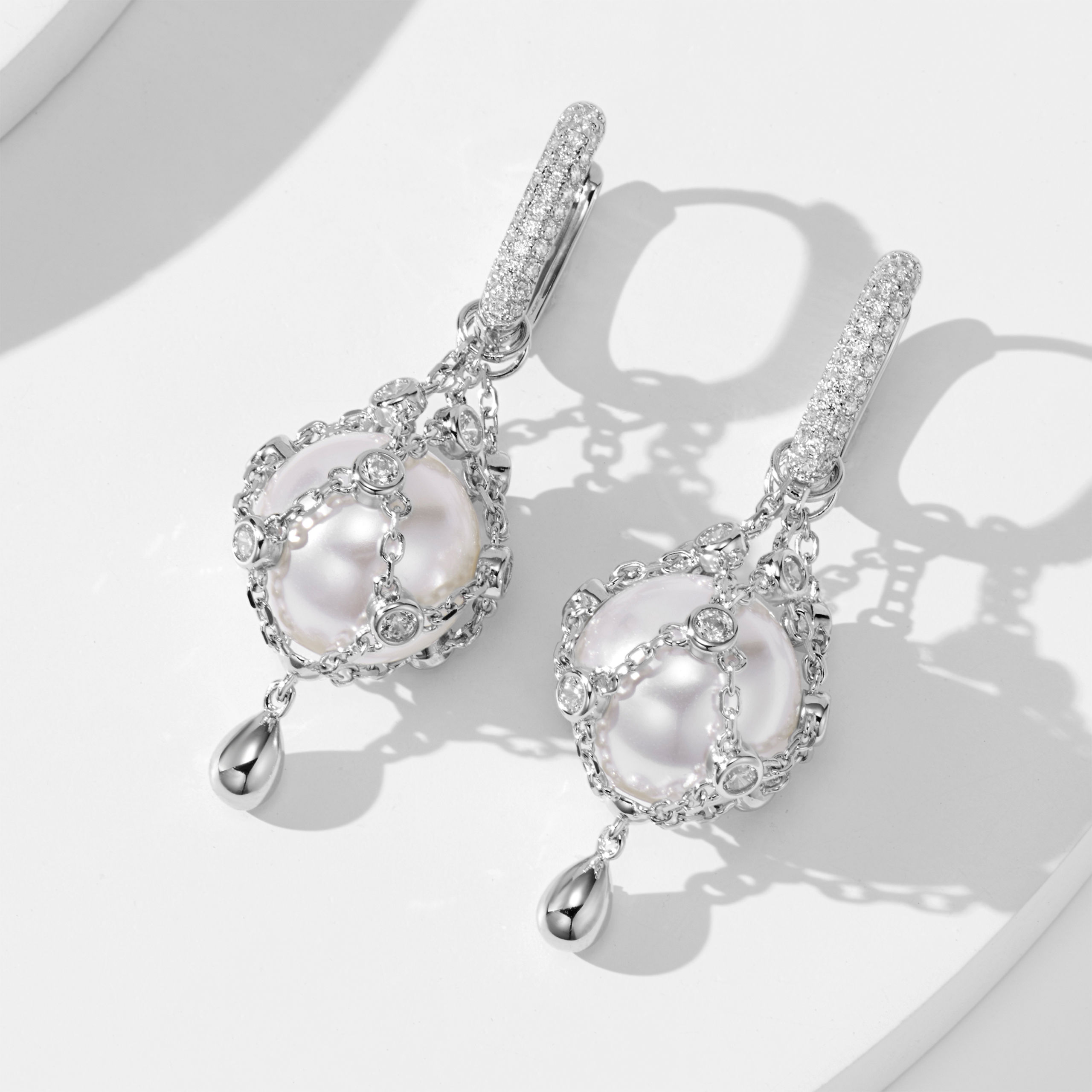 Convertible dual-styling design: mesh pouch cradles 12mm lustrous pearls, rhodium-plated silver enhances icy sheen. Complimentary crystal adds extra sparkle—effortless elegance for day-to-night versatility 💎