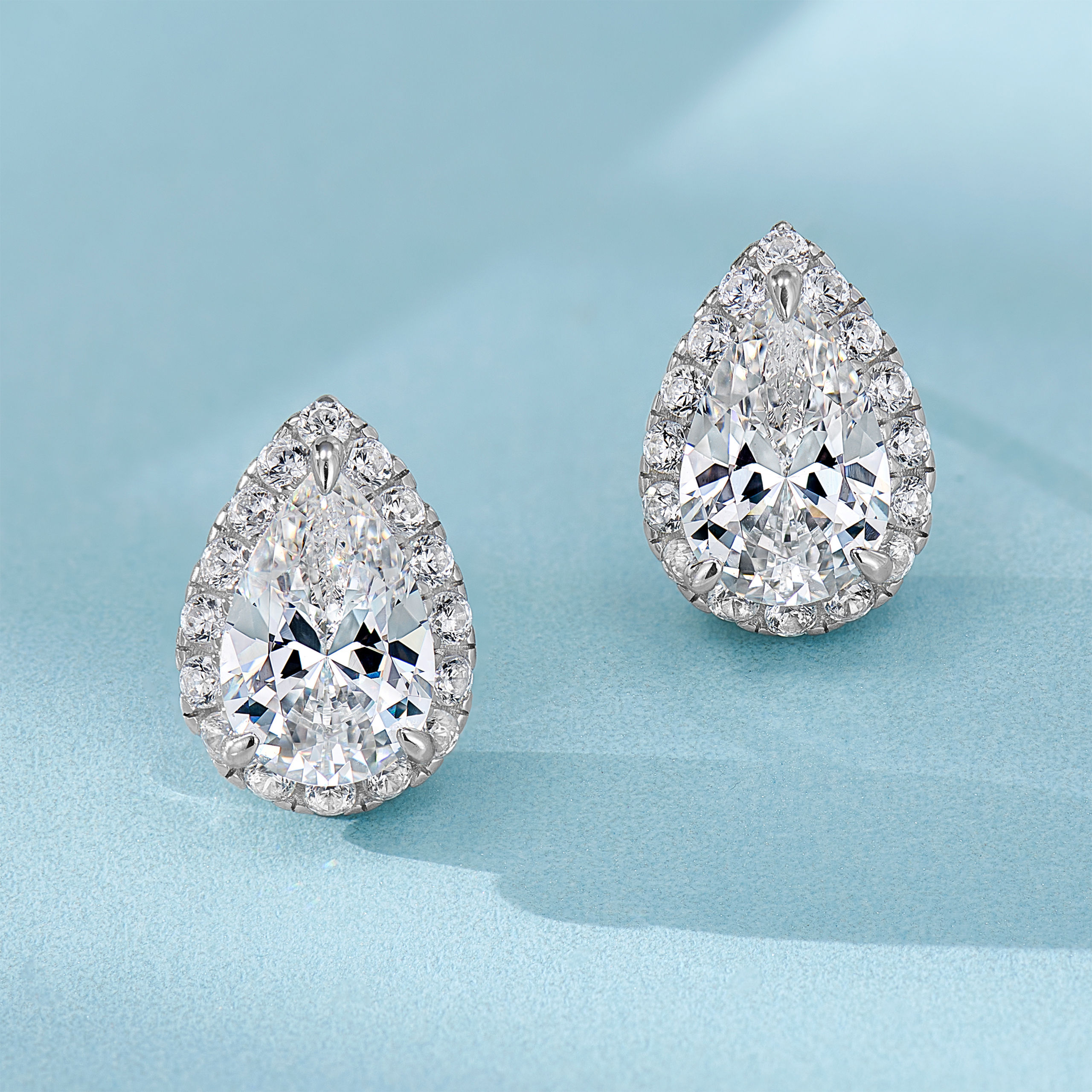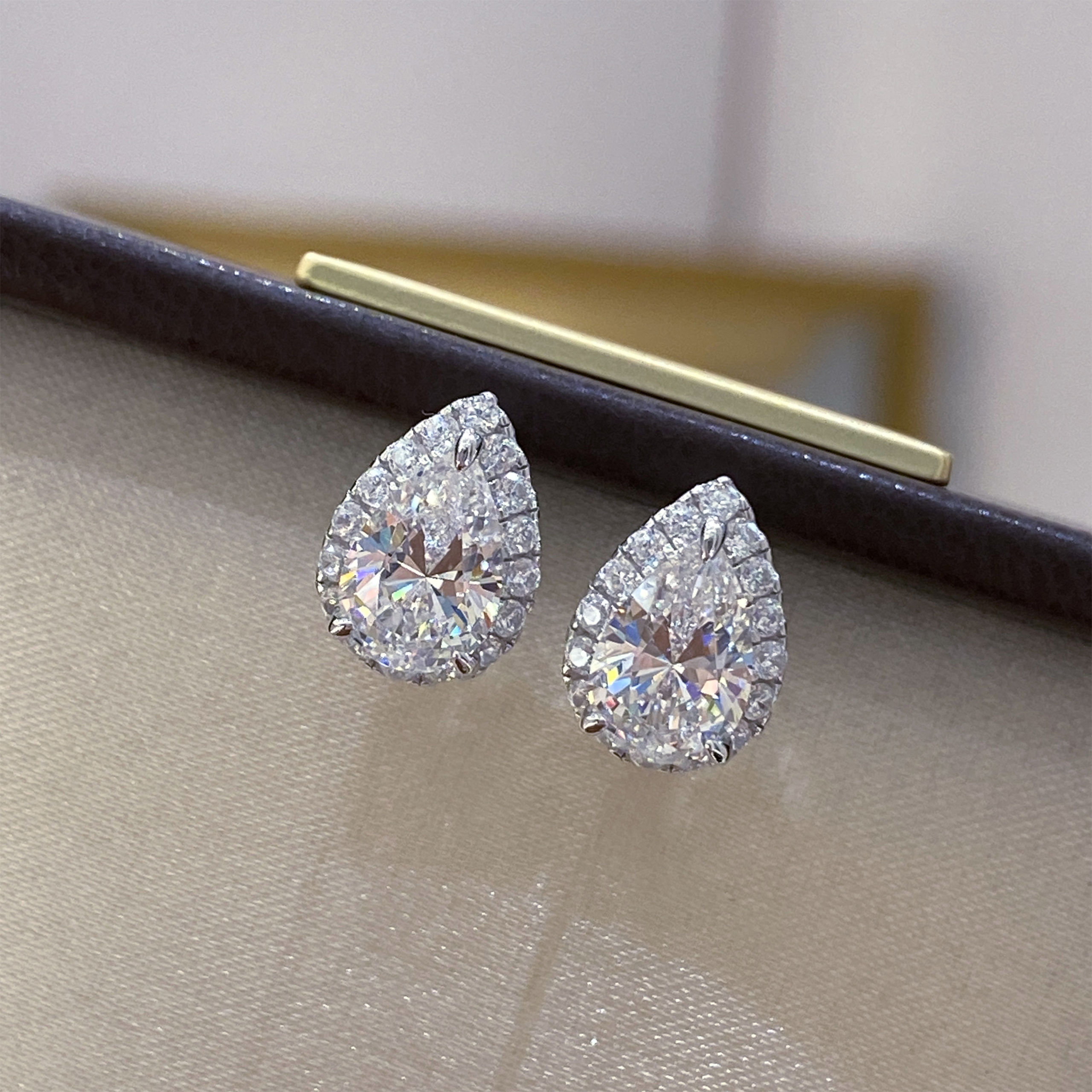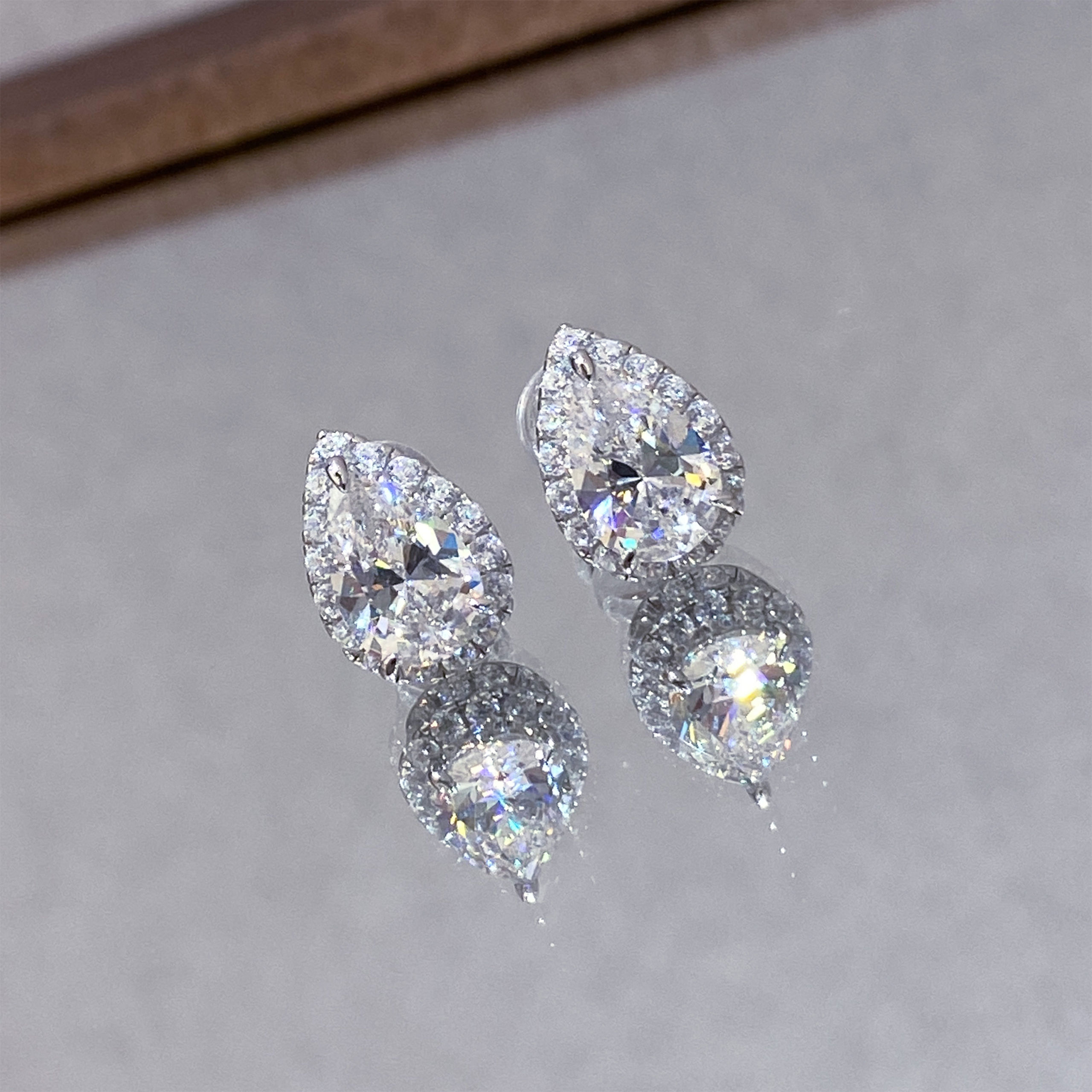1.5ct teardrop center stone embraced by a dazzling halo of micro-pavé, rhodium plating amplifies icy brilliance. Minimalist studs with secure backs—effortless luxury for daily elegance. Sparkles with soft fire, where classic silhouette meets modern radiance 💎